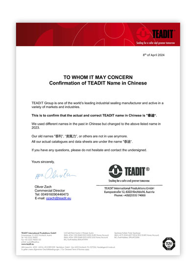 TEADIT于2023年起啟用新中文名“泰迪” 世界領(lǐng)先的工業(yè)密封制造商品牌TEADIT集團宣布:TEADIT于2023年起啟用新的中文名“泰迪”。 過去使用的中文名稱“泰利”、“奧氟力”或其他名稱將不再使用,所有TEADIT產(chǎn)品的中文目錄和數(shù)據(jù)表都將以“TEADIT泰迪”為名。 上一個 返回列表 下一個